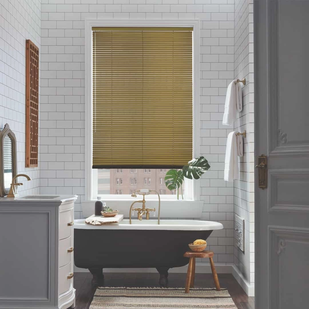EverWood® Alternative Wood Blinds and Modern Precious Metals® Aluminum Blinds are great choices. Both are made from moisture-resistant materials that won't warp or fade. Aluminum blinds are also resistant to rust. Blinds also benefit from greater light and privacy options than shutters. With a wide selection of finishes and colors, you can match your window treatment to your faucets or add a burst of color to a white bathroom.