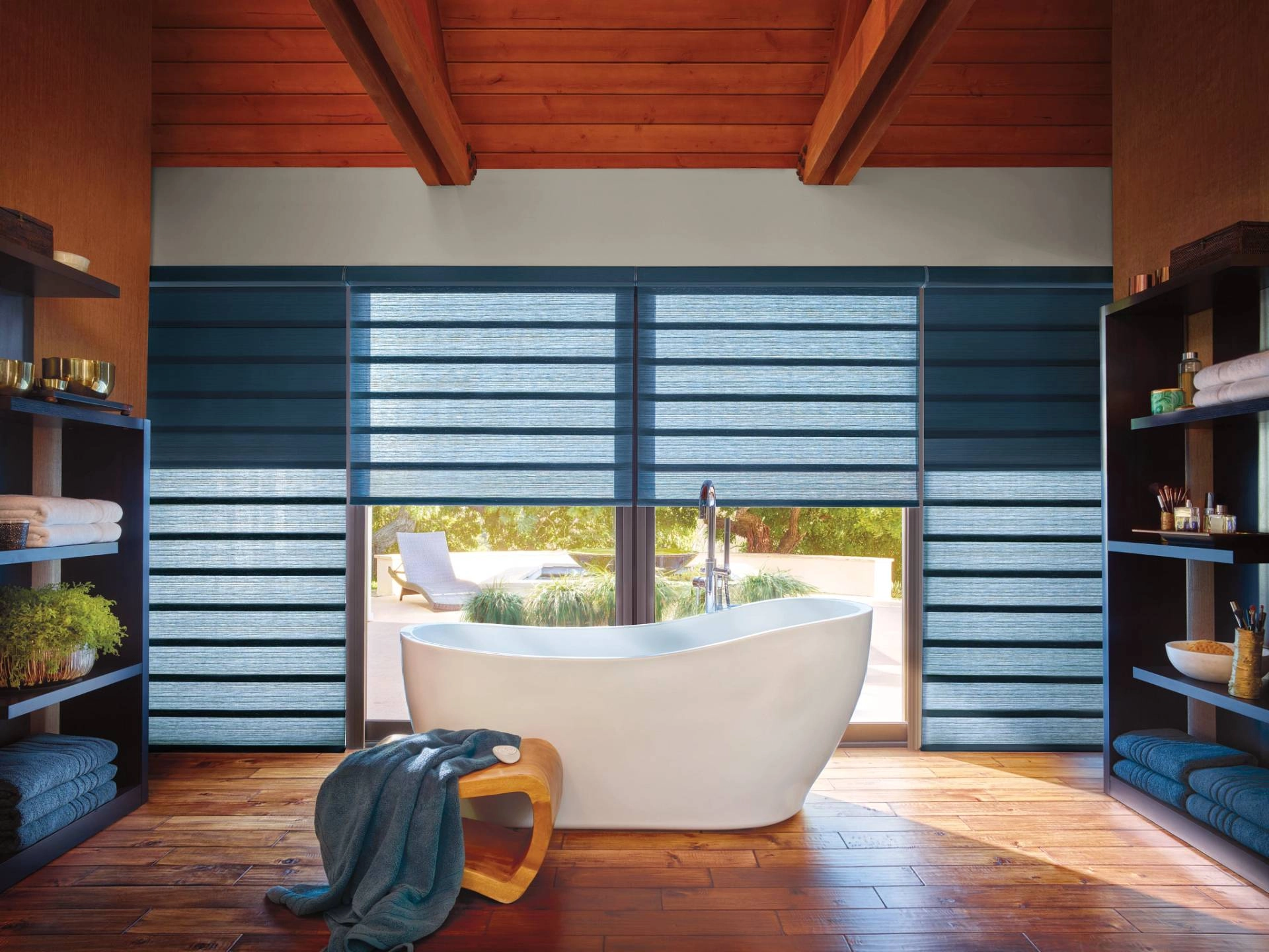 Homeowners desiring a stately, sculptural look for their bathroom shades should consider Vignette® Modern Roman Shades from Hunter Douglas. Featuring uniform folds and an array of gorgeous fabrics, these minimalist shades soften your bathroom and add a sense of elegance. You can also enjoy light control and privacy in one with the available Top-Down/Bottom-Up design or Hunter Douglas Duolite® system.